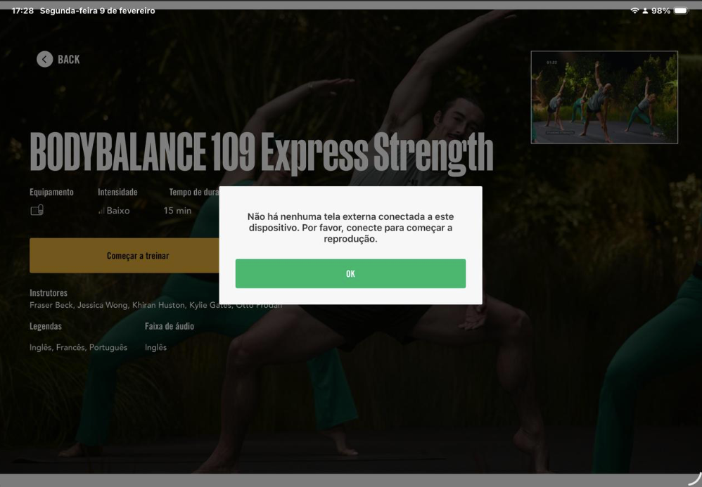 Essa mensagem aparece quando o aplicativo LES MILLS Virtual perde a conexão com a tela externa (TV, projetor ou parede de LED).